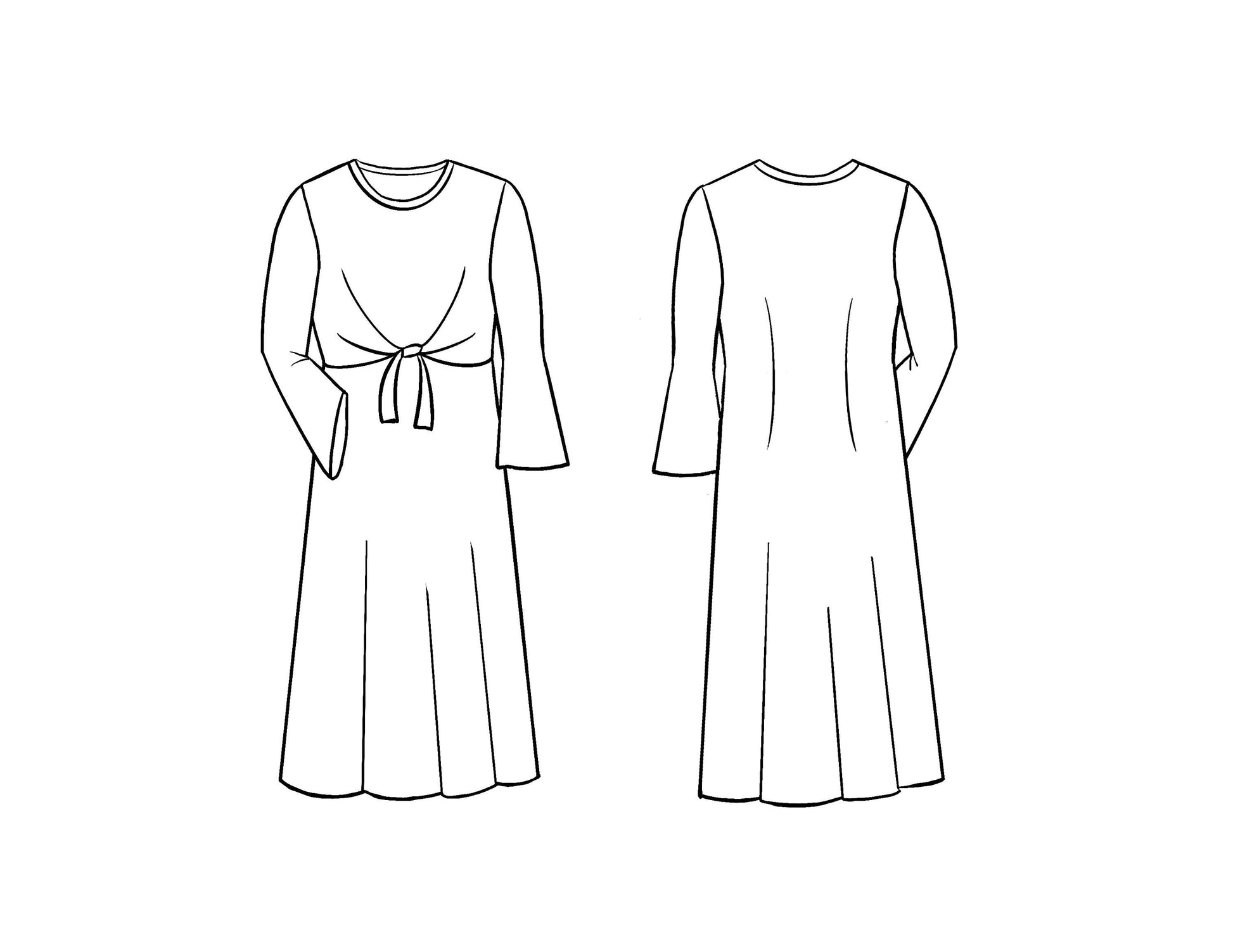Sew knits that fit! This shift dress has an elegant tie front overlay and elbow-length fitted sleeves. It has a pullover neckline with a neckband. Optional back waist darts or elastic. This basic dress pattern includes 3 sizes, each with two waist sizes, and detailed measurement charts. The waist and hip are semi-fitted and allow for some variation.